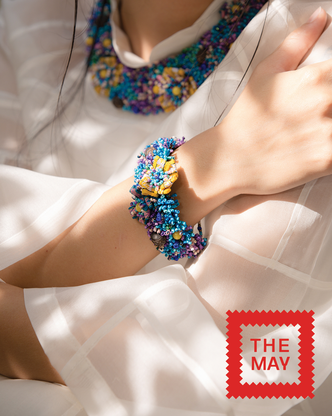 Chất liệu: thổ cẩm Ba-na dệt tay, gốm Bàu Trúc, vải sợi bông của người Thái, hạt cườm Miyuki và đá Thạch Anh