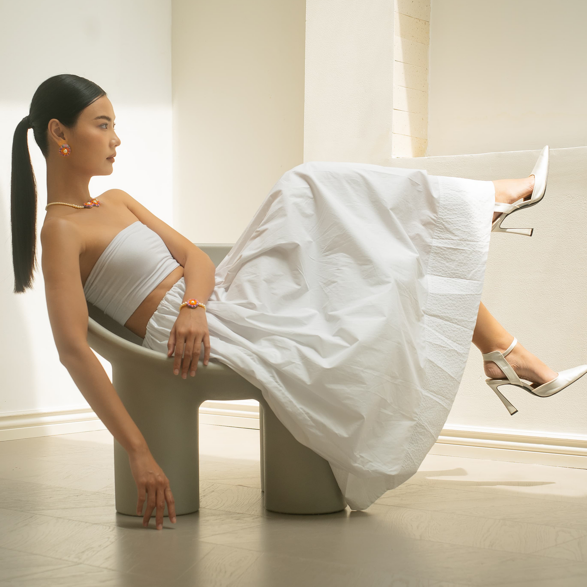 Ứng dụng kỹ thuật cuộn và nhồi bông tạo độ form phồng tròn cho dải thổ cẩm, nhà thiết kế theMay kết hợp hạt trai Swarovki và thổ cẩm Ba-na dệt tay trong tạo hình hoa cà phê, mô phỏng lại vẻ đẹp tinh khôi, rực rỡ mỗi mùa hoa nở.