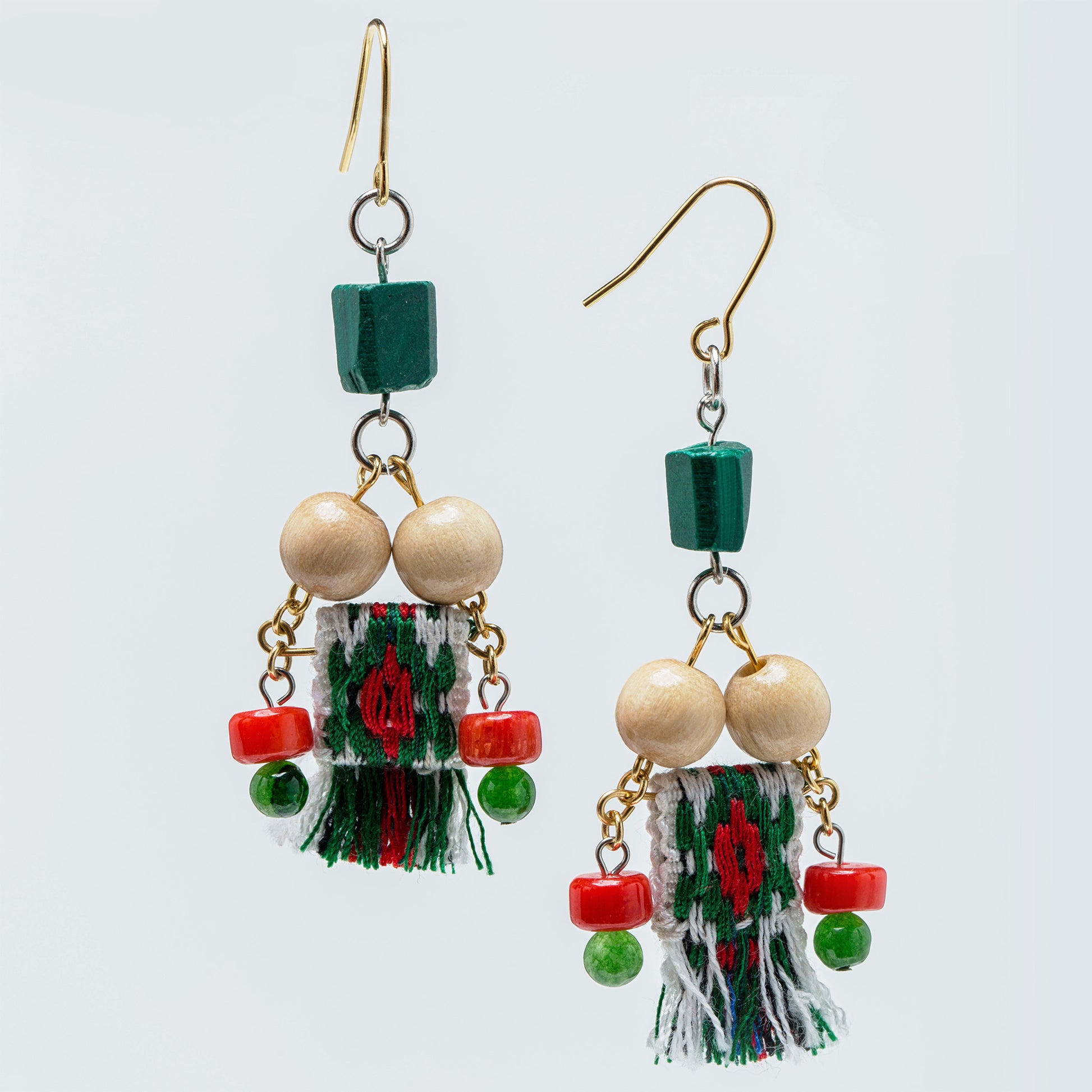 Chất liệu: Thổ cẩm Chăm dệt tay, đá san hô, hạt gỗ